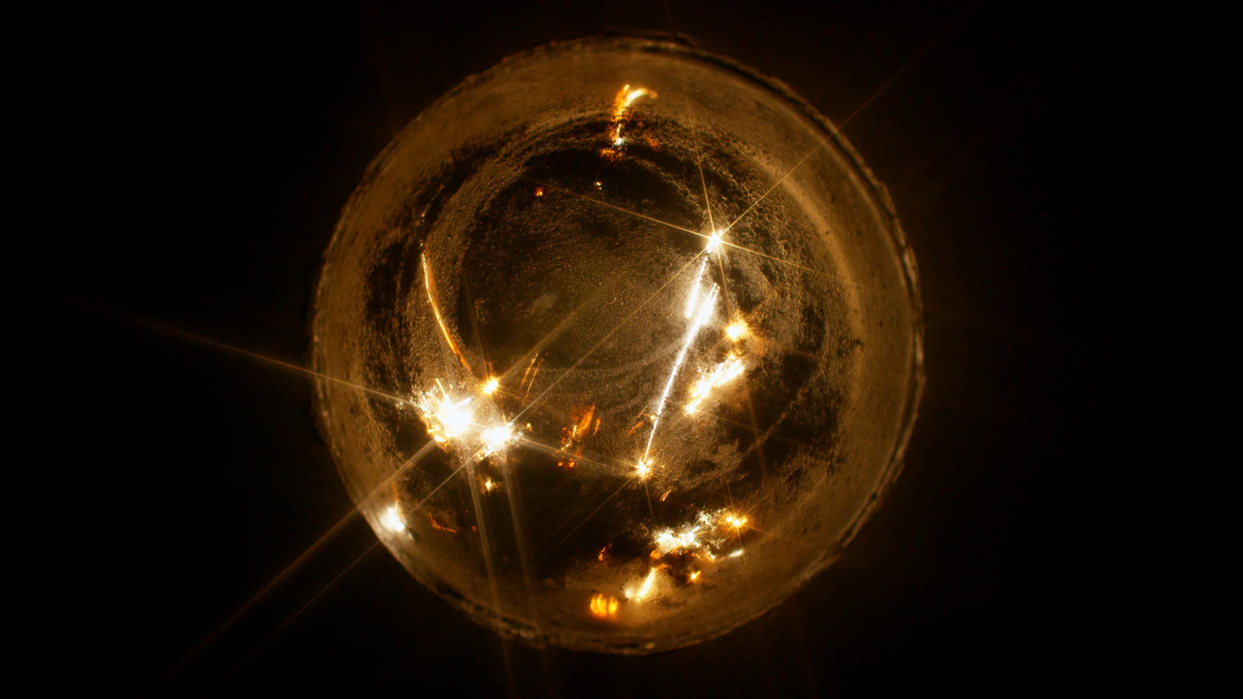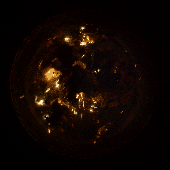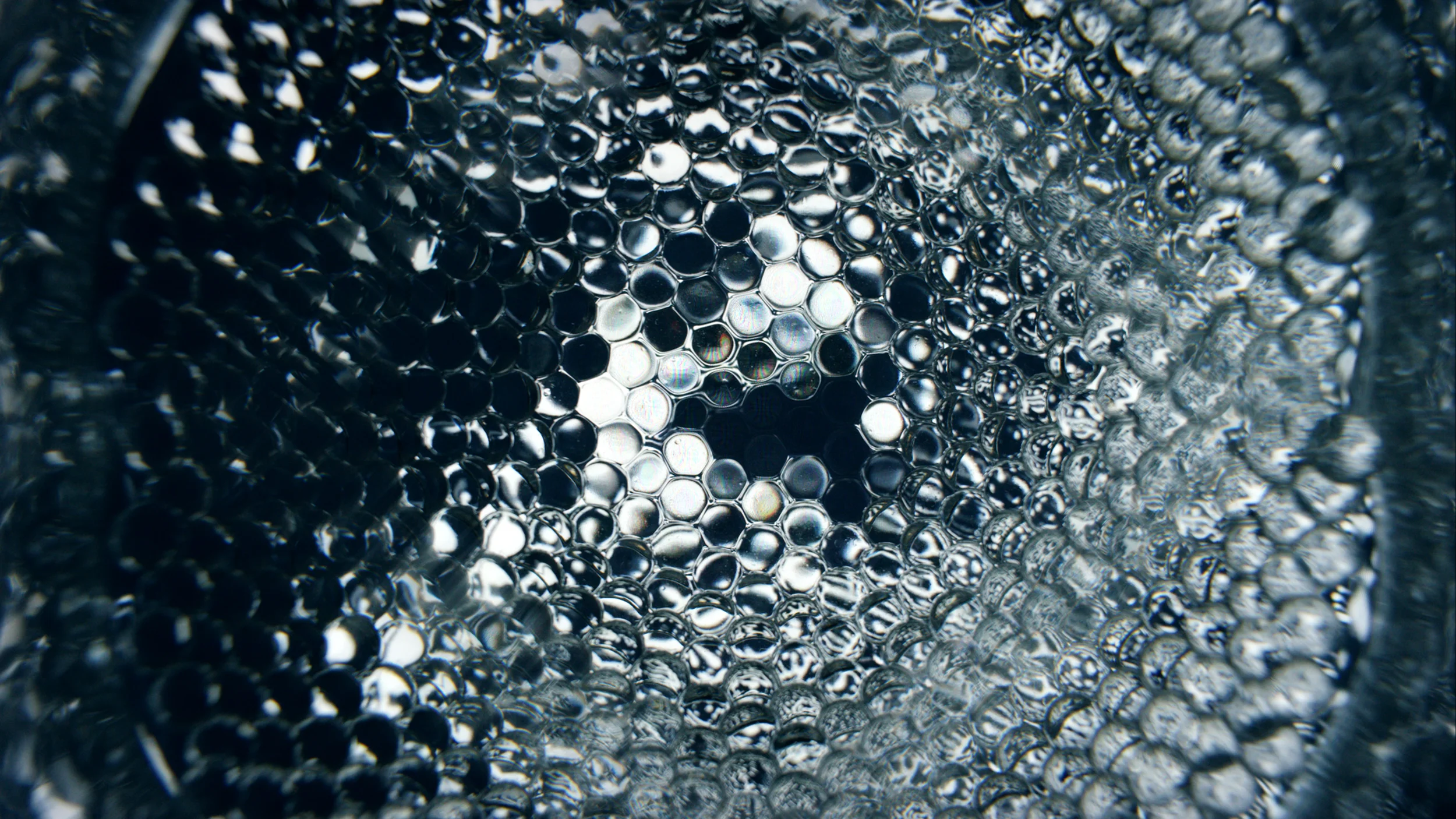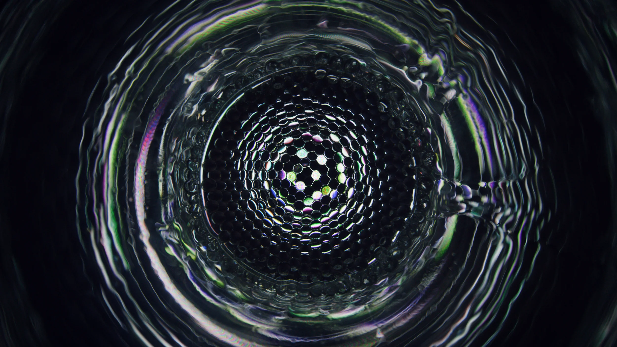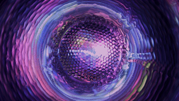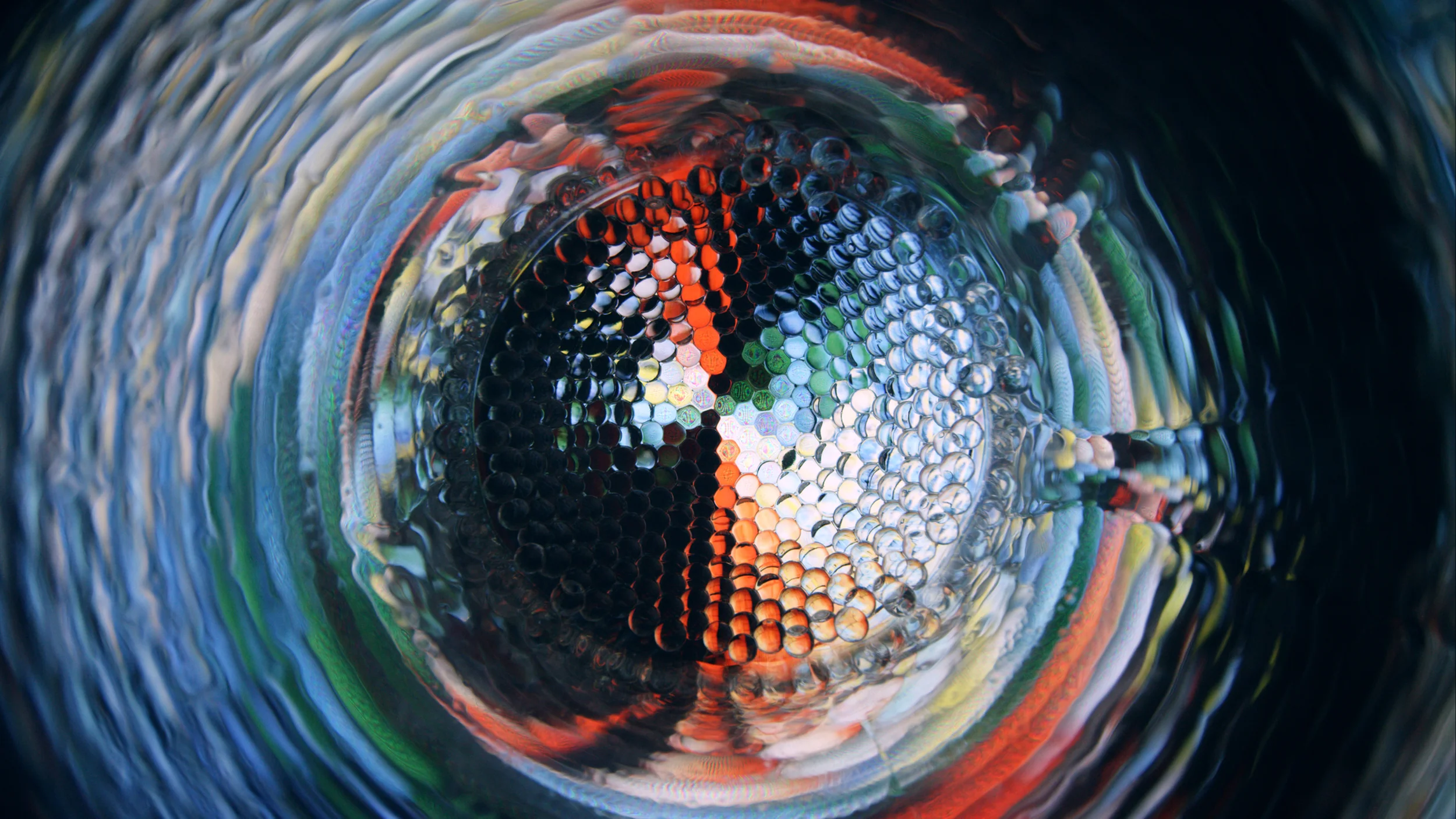 This concept was particularly satisfying, not only in its simplicity but because it was a physical manifestation of our digital work in 3D. We found these silicone balls at a craft store, when you soak them in water they become perfect little clear spheres with the same refraction index as water. In open air they act like perfect sphere lenses, a familiar tool in regards to creating optical refraction art in 3D. We lined the bottom of a glass bowl with a single layer of balls, and propped it on top of a display and ran a bunch of trippy / oppy textures. The outside of the glass bowl was lined with mylar because….when the opportunity to add even more sparkle and reflection arises, we jump on it. The whole rig acted like a giant compound eye, distorting and transforming the screen content beneath the bowl into a hundred tiny spheres.