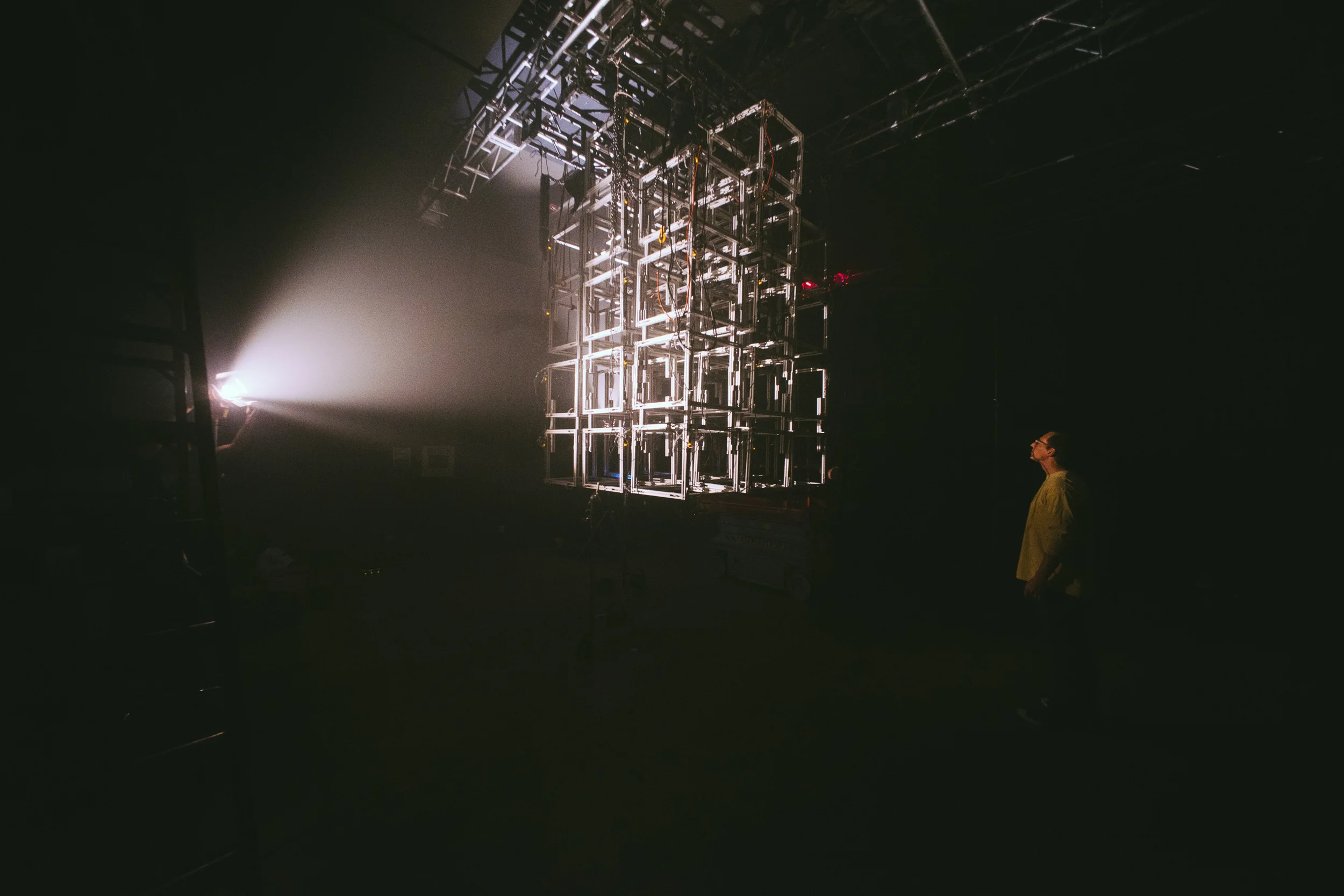 We decided to hang the sugar tubes from the grid, exposing the open end of the towers to the camera from below. This allowed us to boom the dolly straight up and down giving 4 feet of smooth hydraulic travel. The motion control camera head was stacked onto 4 feet of mitchel risers. Allowing the camera to travel the a narrow straight path upward. Hanging the sugar cubes also allowed us to cluster 9 towers closely together. With the motion control head we were able to smoothly pan and tilt the camera inside of the sugar cube abysse as the hydraulic column lifted and relaxed.