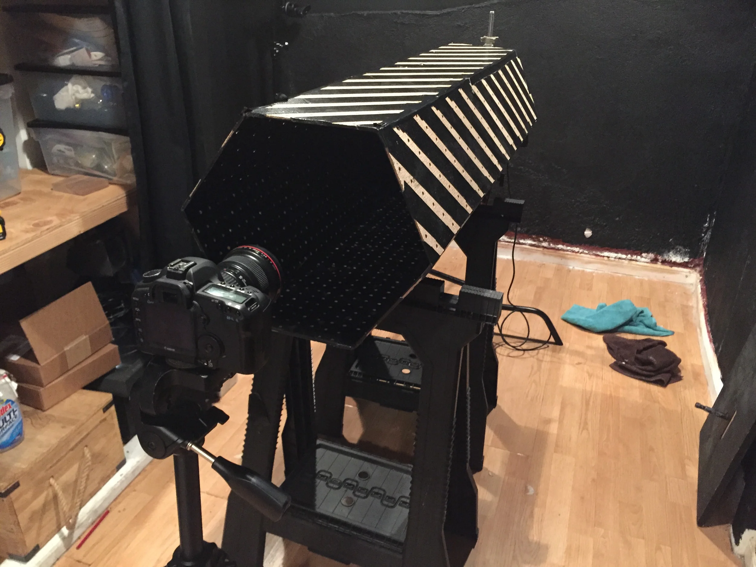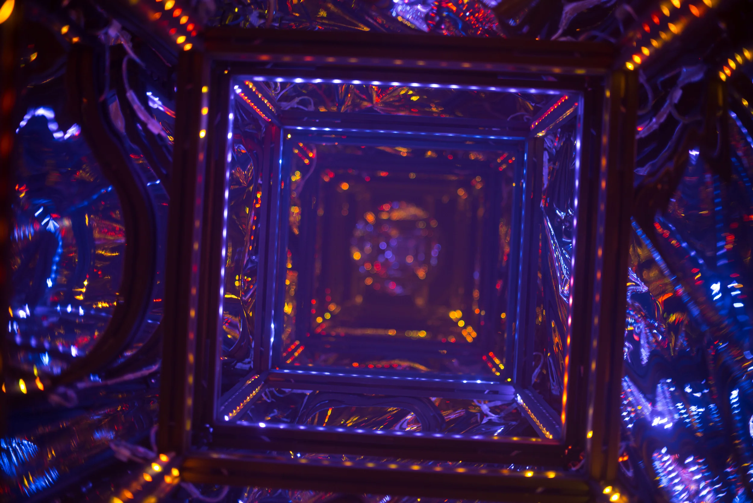 The second approach was even more involved and technical. 5 cubes were spray painted jet black and the LED strips were flipped to only face internally. Then 24 18’’ convex mirrors were placed in the open faces of the cubes.We used the cubes as a real-life fractal generator. This was a novel way to use the cubes, one that I never anticipated when I built the sculpture.