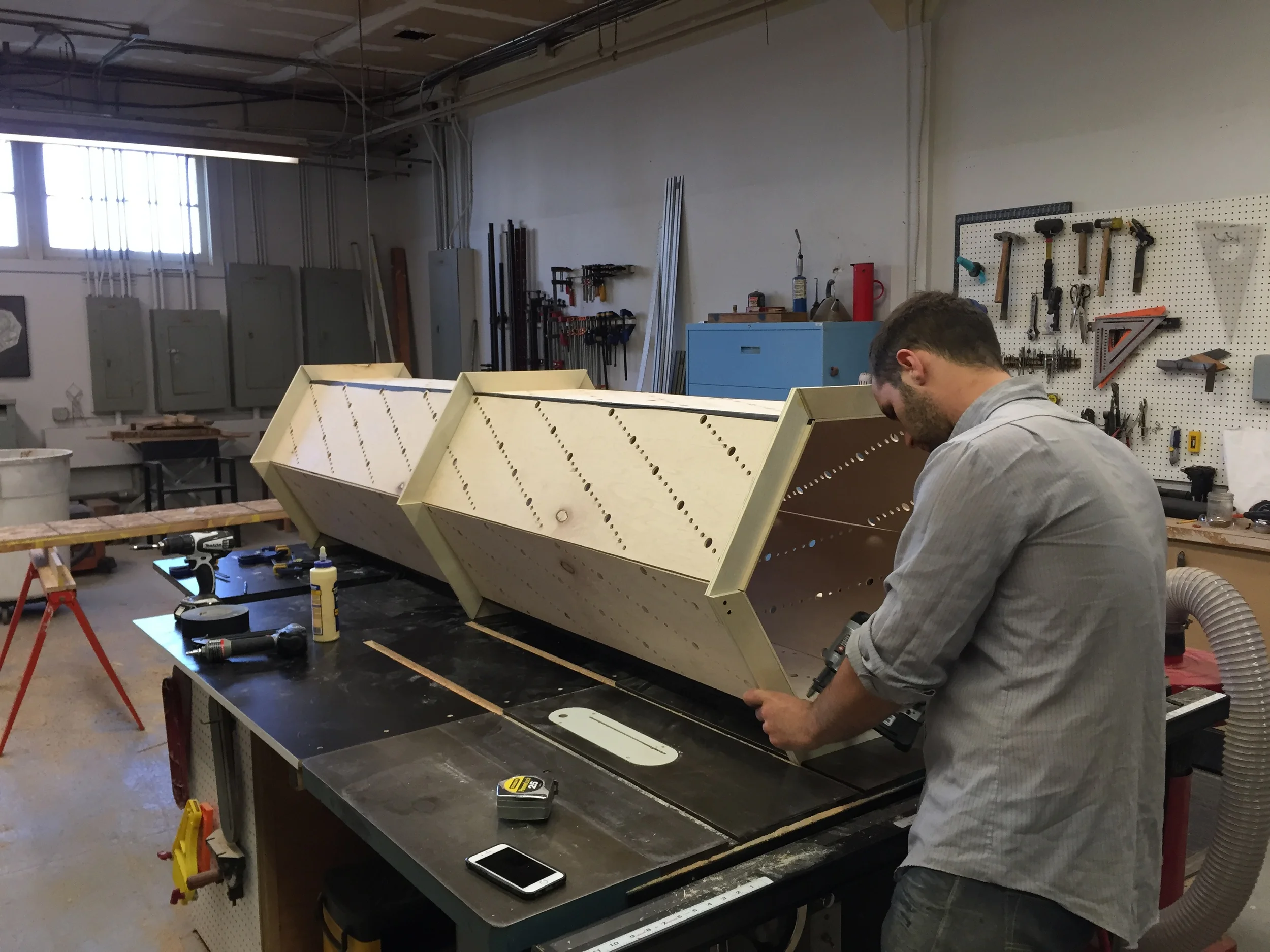 The perf tunnel is essentially an 8 foot hexagonal tube, open on both ends, with a pattern of holes cut into the sides. It came out of the idea to use the magic and brilliance of volumetric light to create a surreal and overwhelming physical environment that evoked depth and motion. We started by running some tests in 3d, and went on to build several smaller prototypes out of peg-board, testing them with a small fog machine and hand held shop lights. Even with these crude materials, the test footage was impressive and we knew we were on to something. After a few more tests, we were ready to build the real thing...