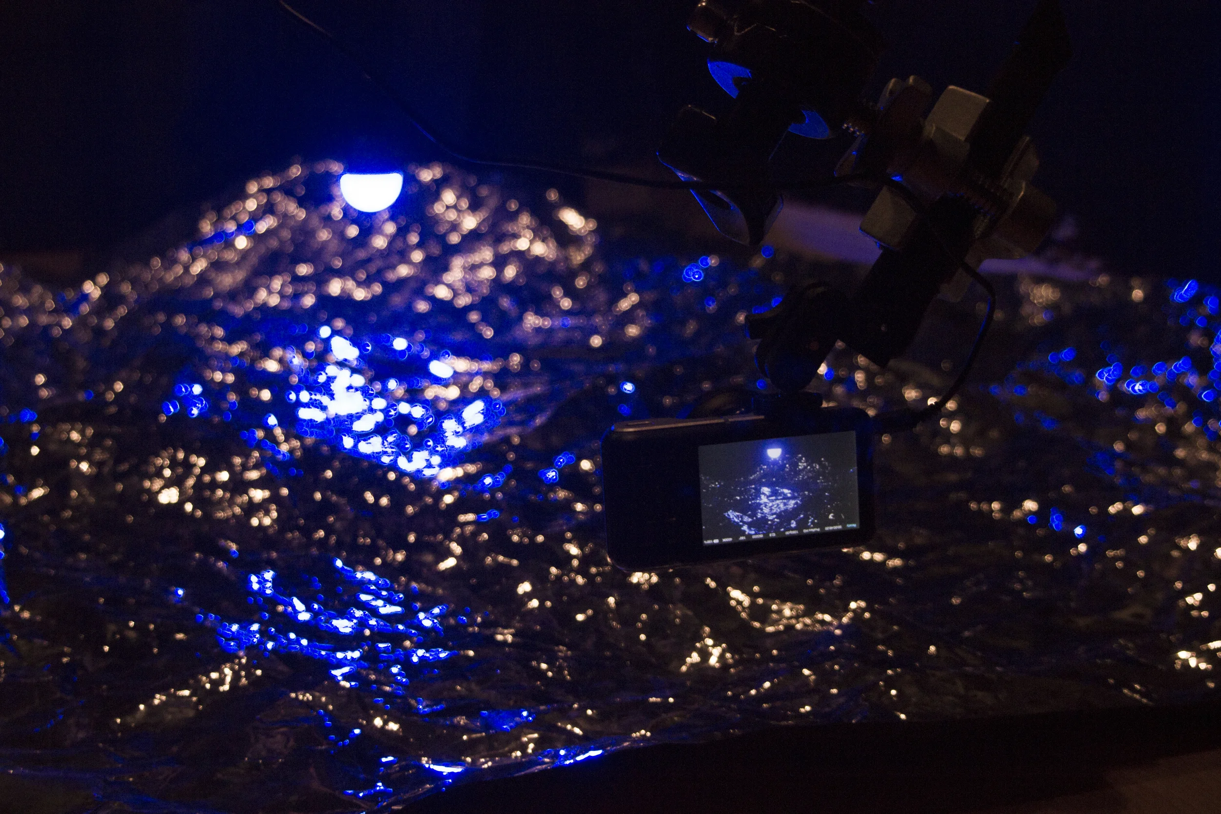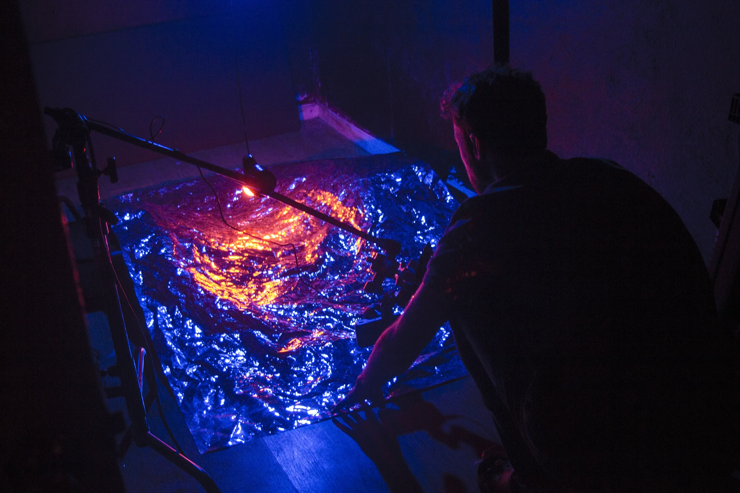 These surreal landscapes were constructed by bending large mylar sheets into mountainous forms. We waved LED bulbs off camera to create the light that bends and crawls across the mylar. Mylar may very well be our favorite material. When you are in a love affair with mirrored surfaces, a giant roll of bendable mirror sheet will easily win your heart.