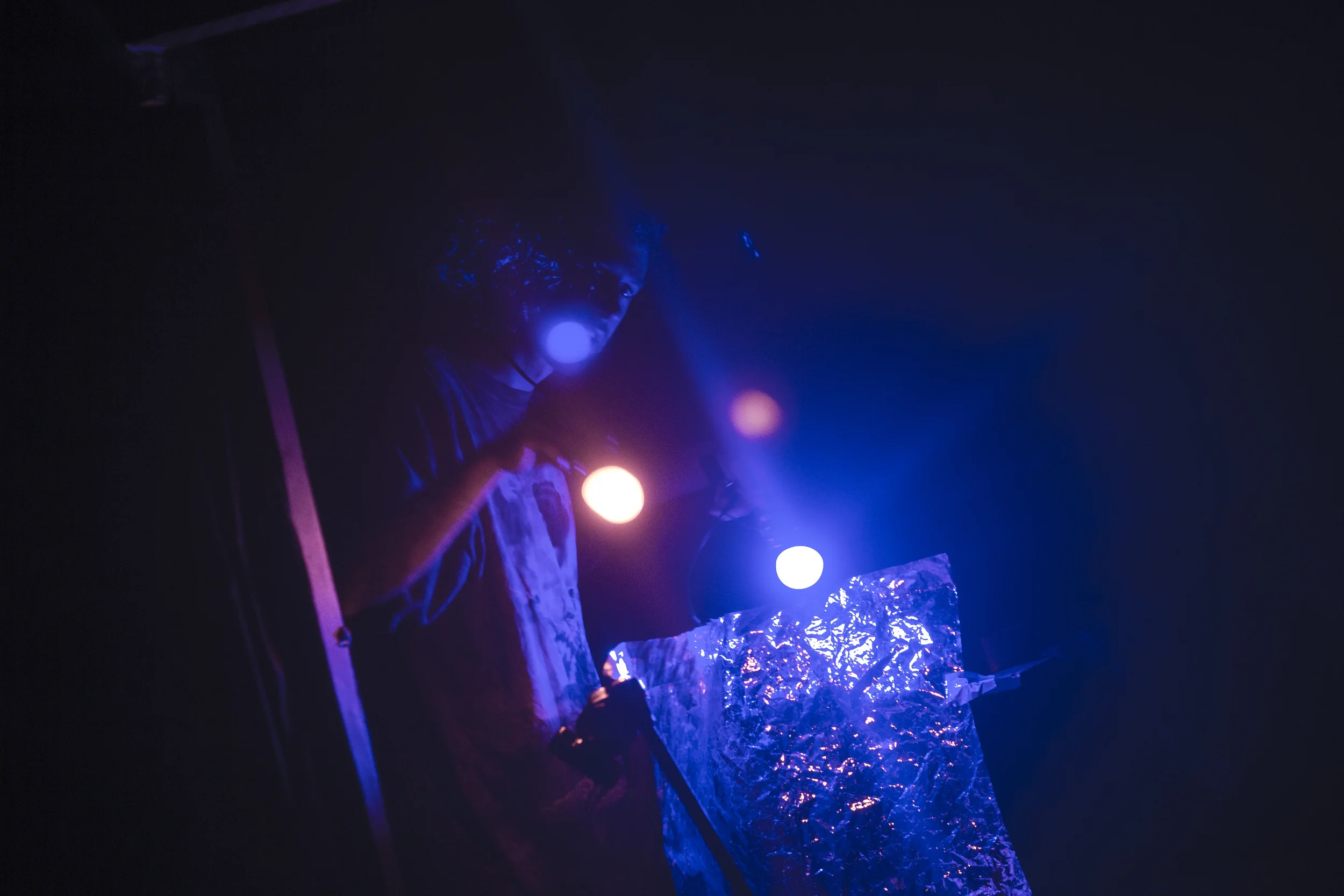 The titles were created with a laptop monitor displaying graphics while a layer of acrylic tubes distorted the image. Led lights were moved around the acrylic tubes in order to create saturated color reflections.