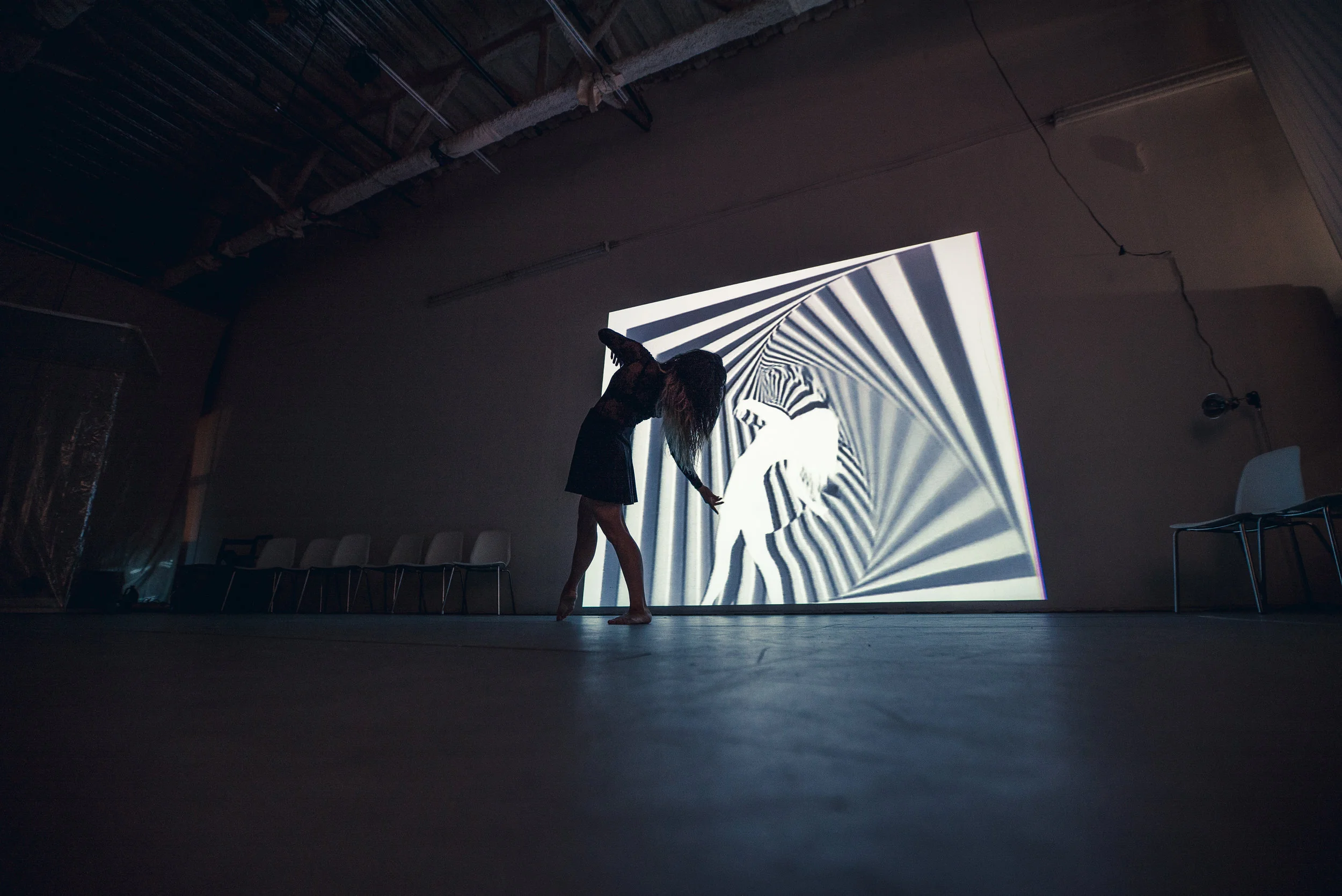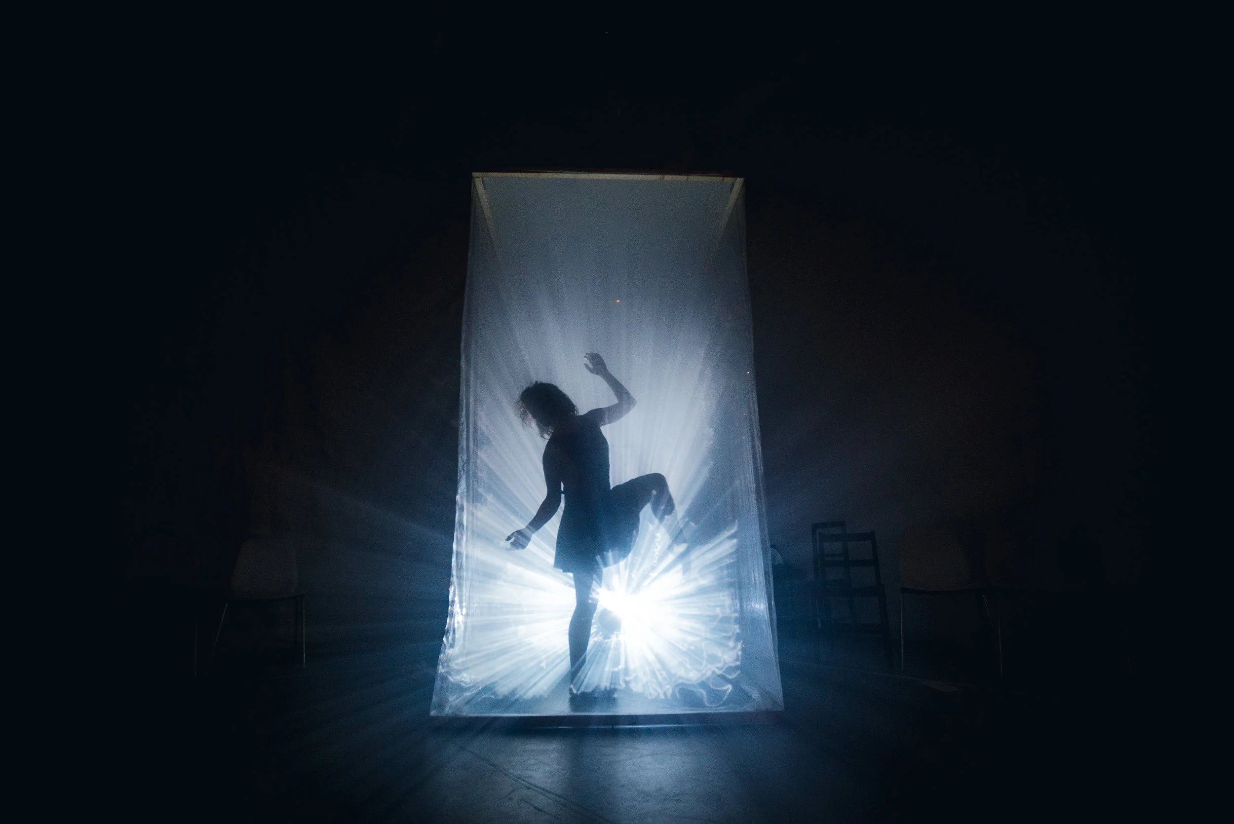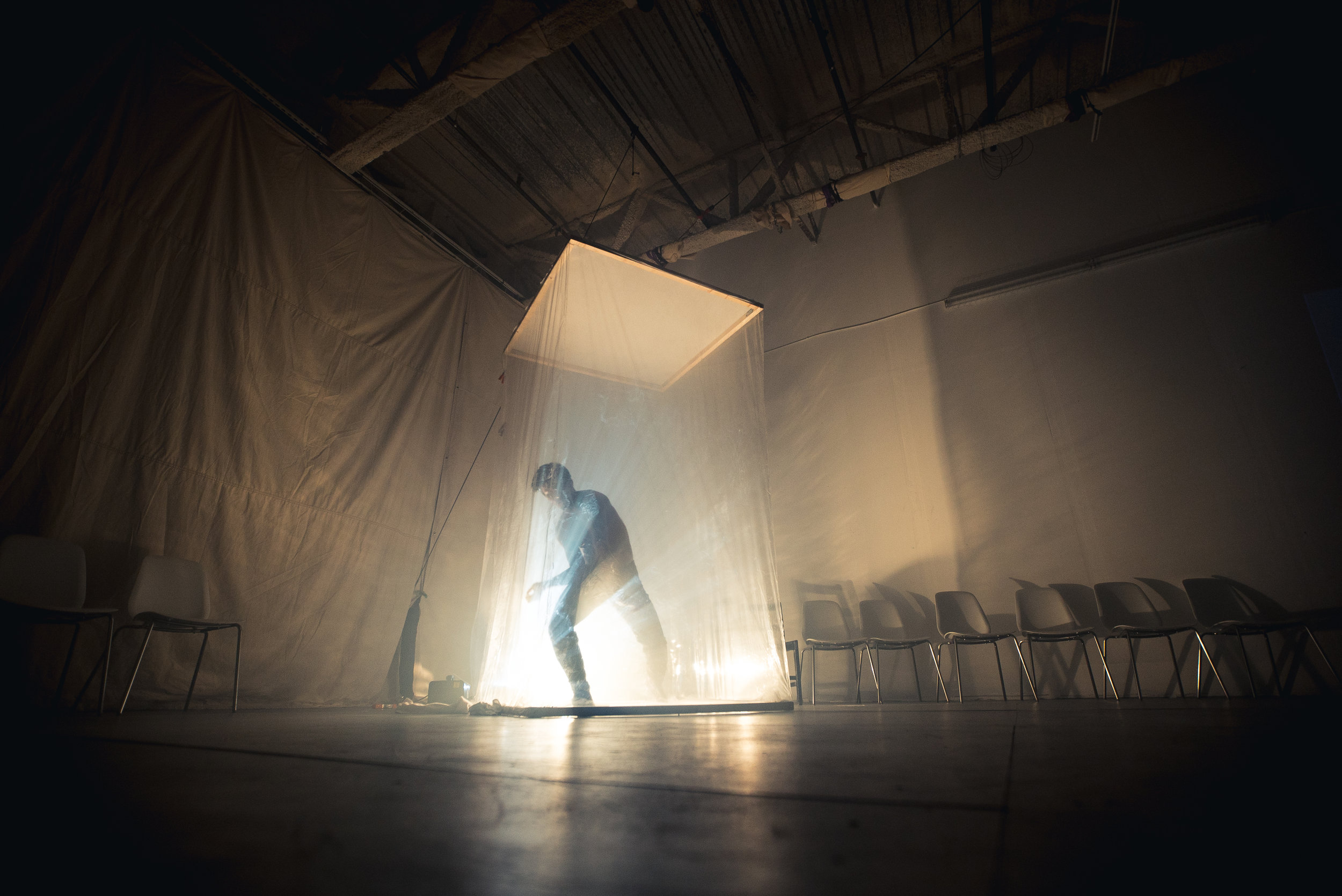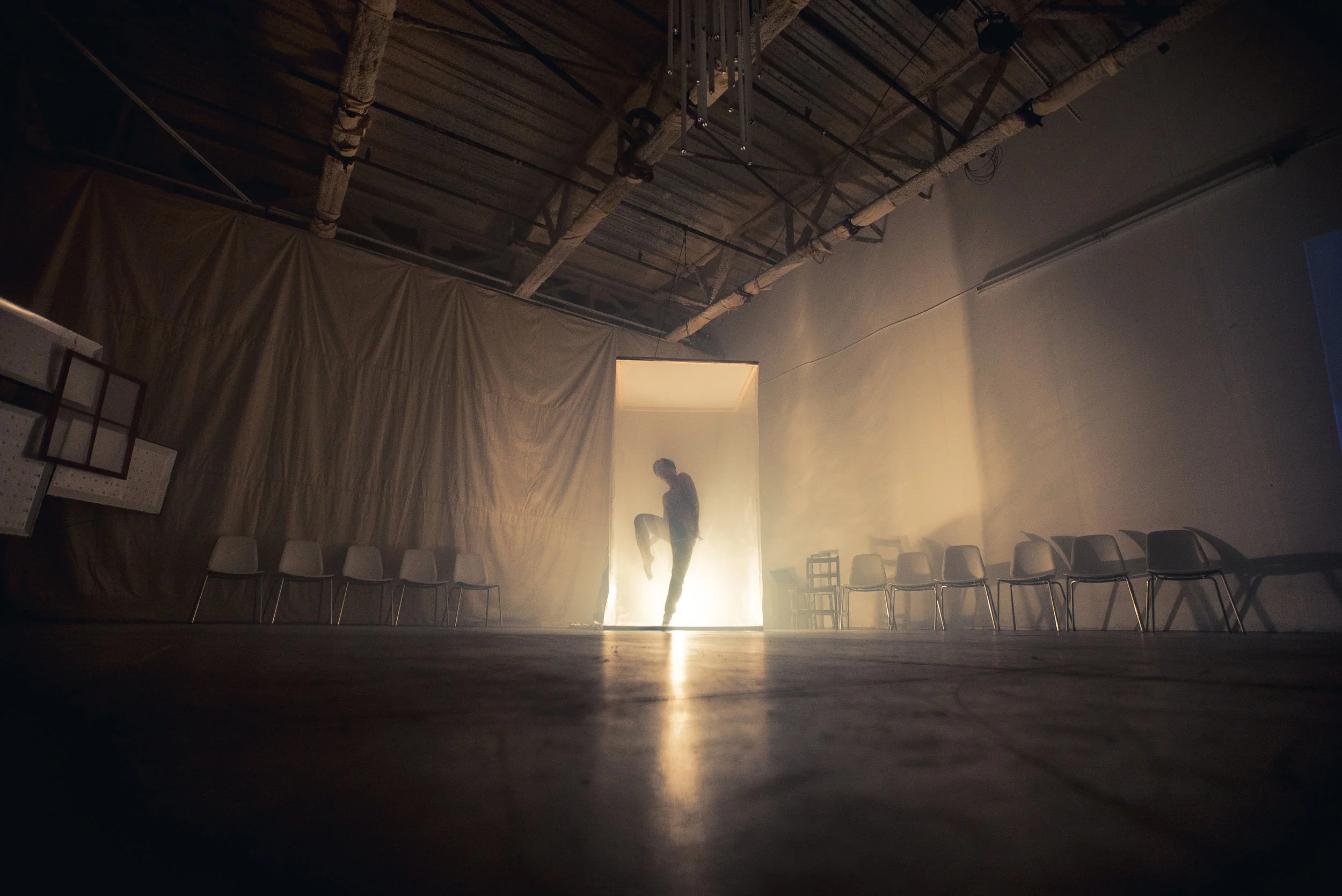 In the Woods Again, Again is a dance, kinetic art, and musical experience that first took place November 2016, in San Francisco. As guests flowed through the space, they got to experience a narrative played out through dance and movement activated kinetic light installations scattered through the space.