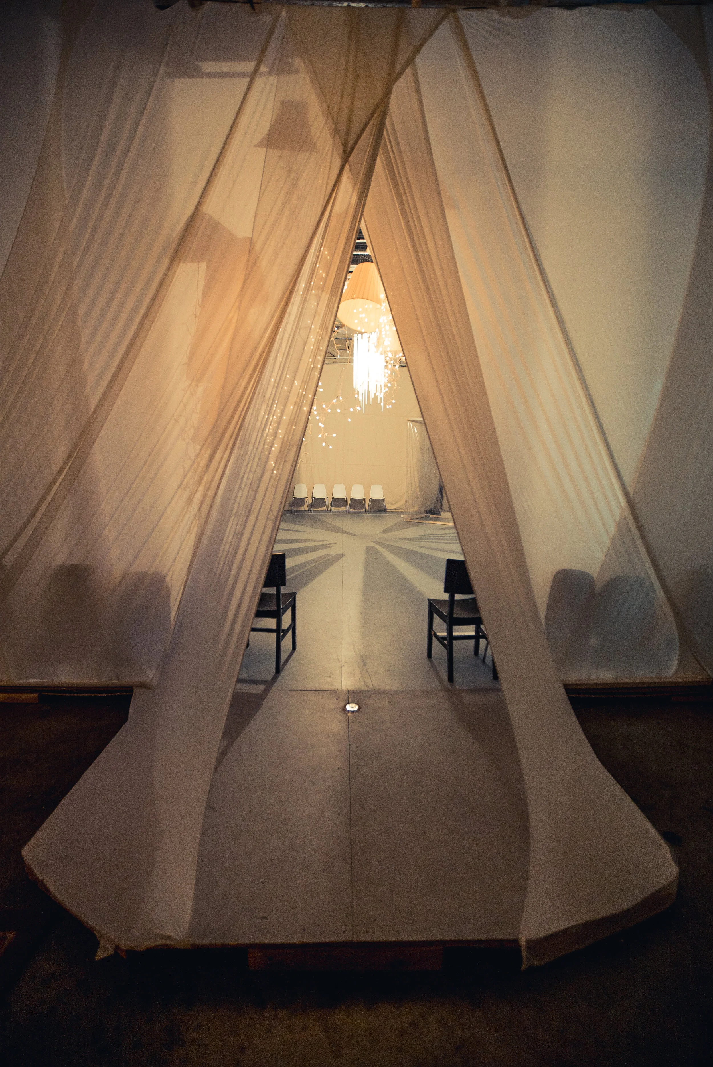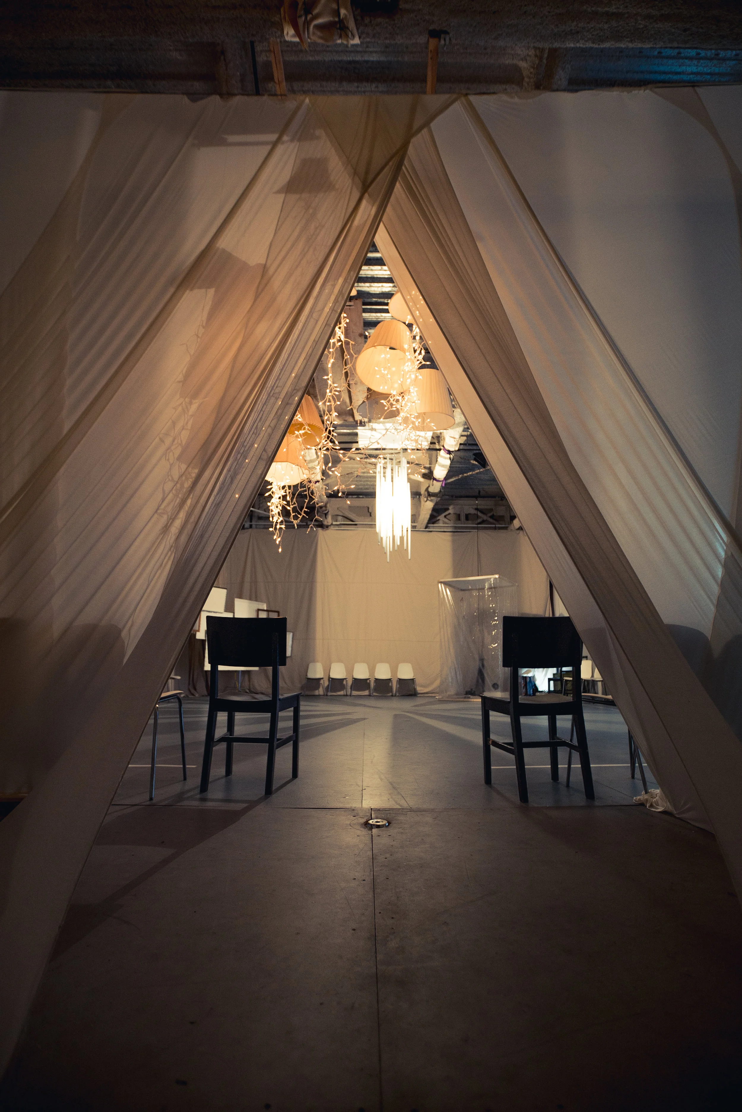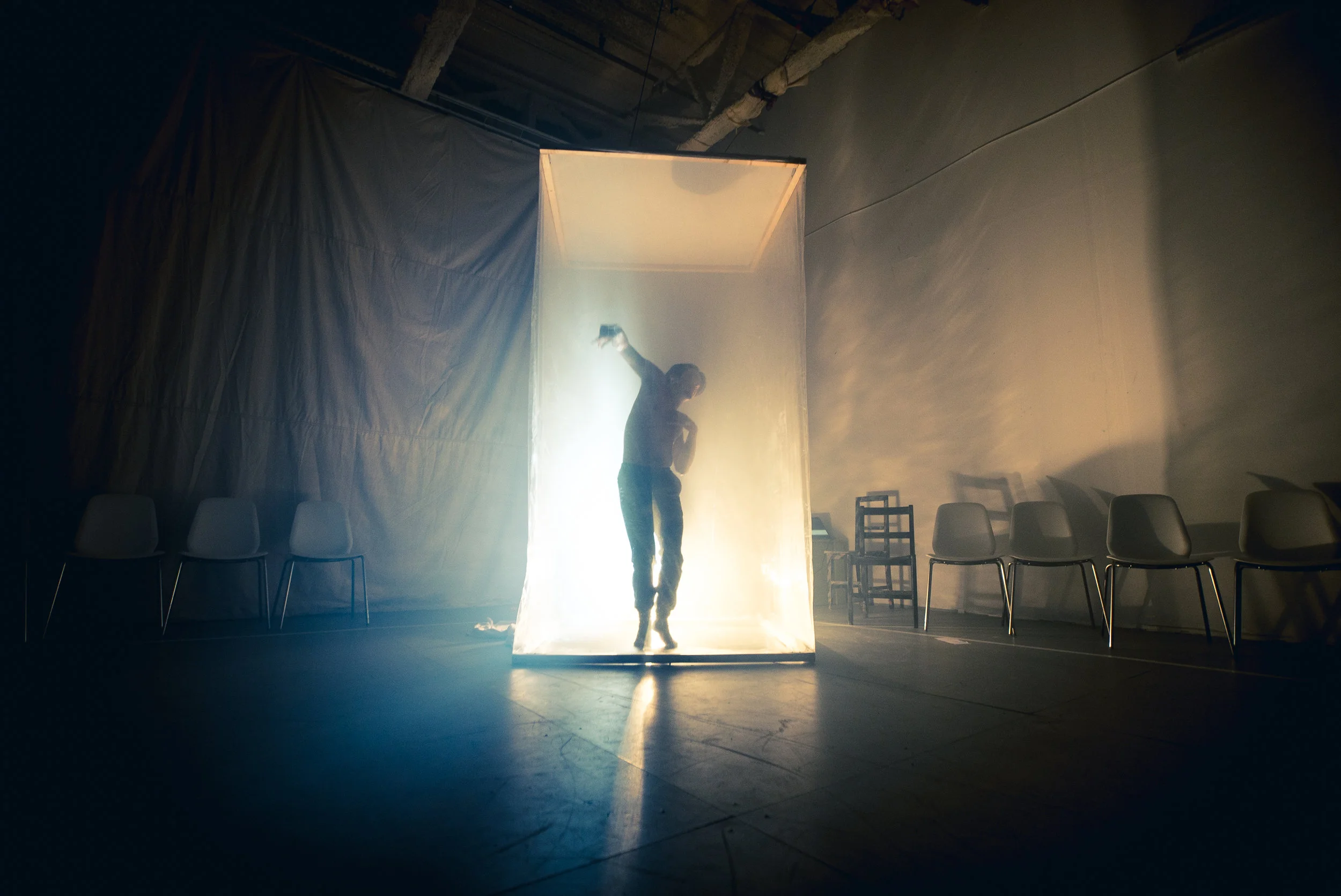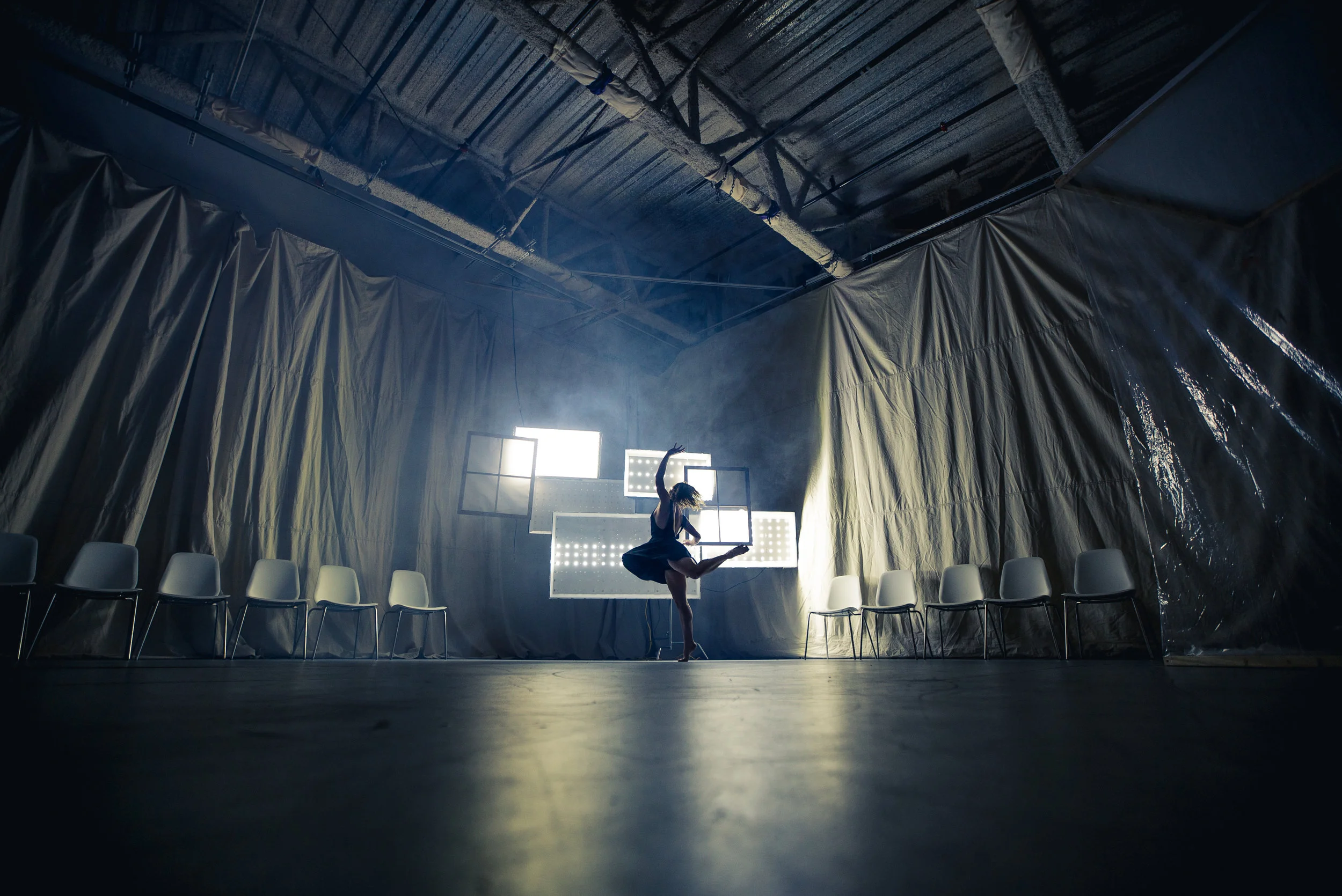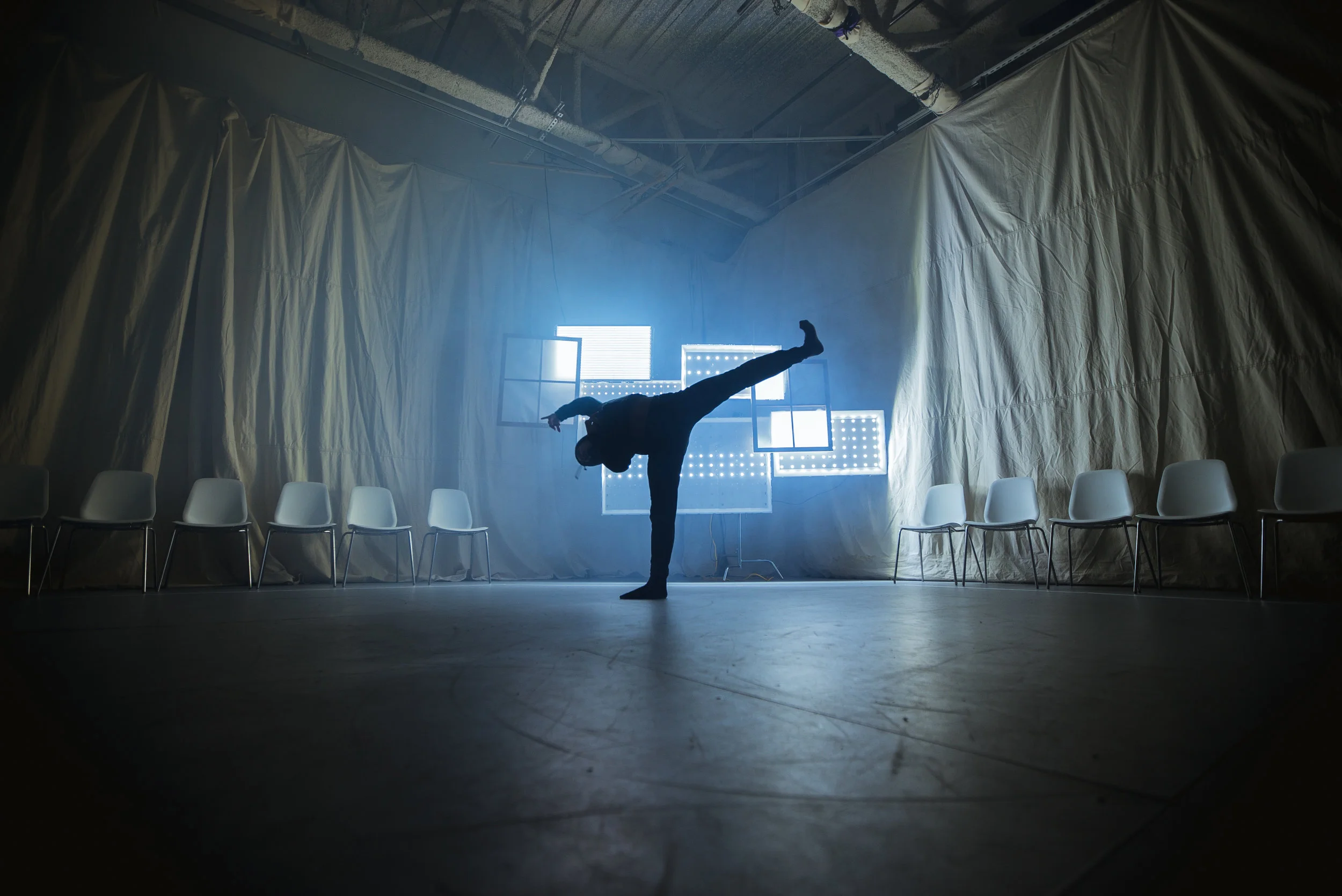 In the Woods Again, Again is a dance, kinetic art, and musical experience that first took place November 2016, in San Francisco. As guests flowed through the space, they got to experience a narrative played out through dance and movement activated kinetic light installations scattered through the space.